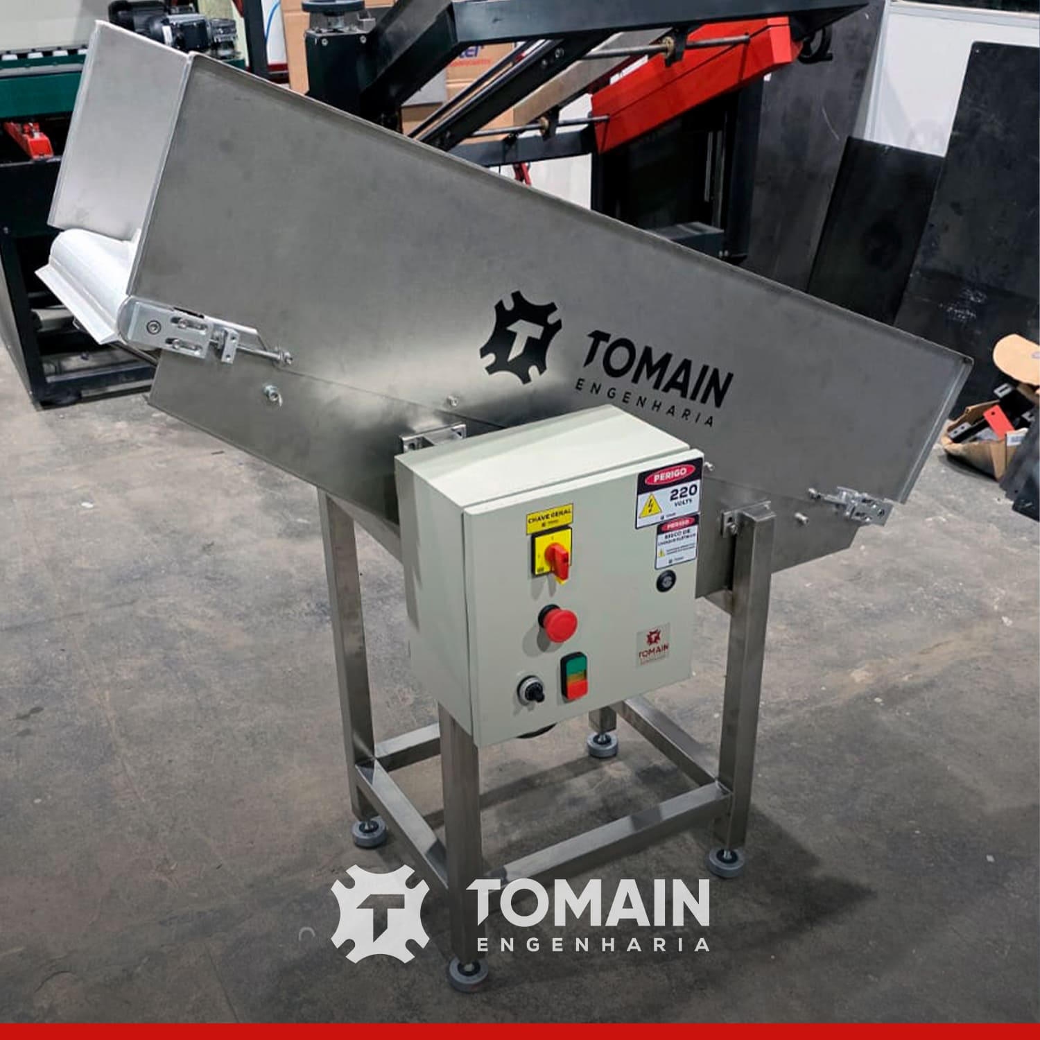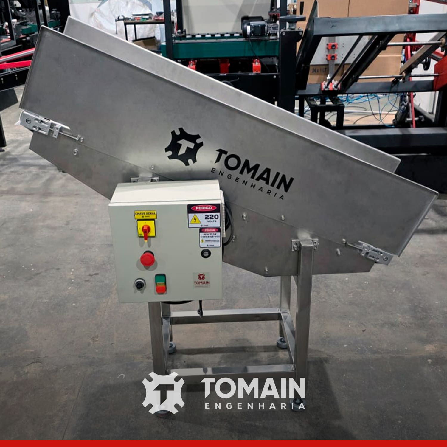 Indicada para indústrias alimentícia, farmacêutica, química, cosmética, automotiva e centros de distribuição, a esteira transportadora da Tomain Engenharia é ideal para transporte de frascos, caixas, sacarias, alimentos e peças em linhas de produção e logística.
