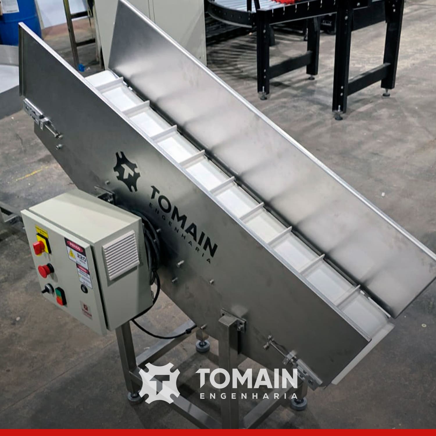 Tomain Engenharia atua com projeto, fabricação e manutenção de esteira transportadora, entregando soluções completas e personalizadas para frascos, caixas, sacarias, alimentos e peças em linhas automatizadas.